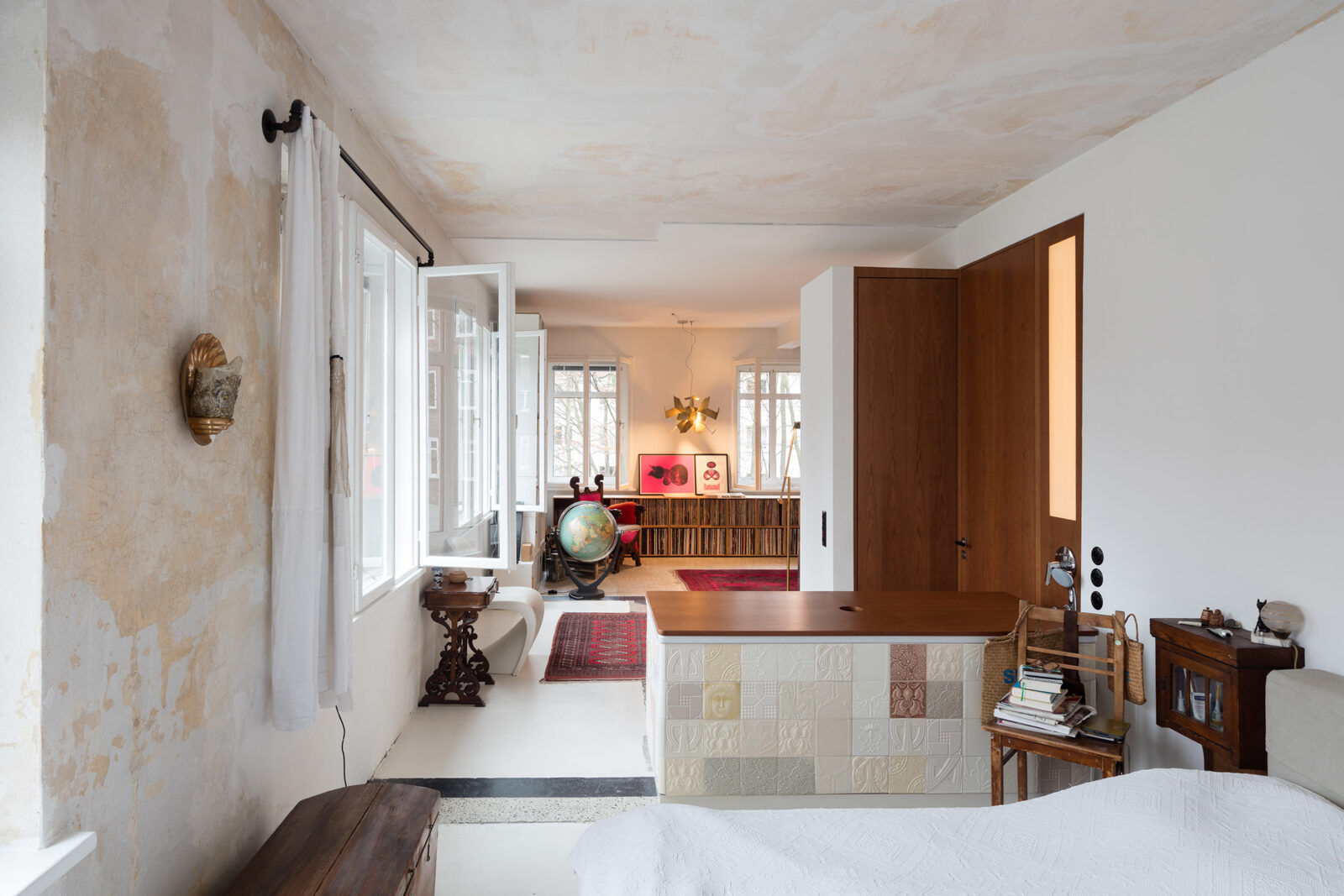 In dem ursprünglich sechs Meter hohen Zeichensaal des Betriebsgebäudes erfolgte zu einem früheren Zeitpunkt der Einzug einer Kappendecke. Im oberen Teil dieses Volumens befindet sich heute die neu ausgebaute Fläche. Dieses Fragment des ehemaligen Luftraumes des Zeichensaales sollte innerhalb der Wohnung ablesbar und erlebbar bleiben.