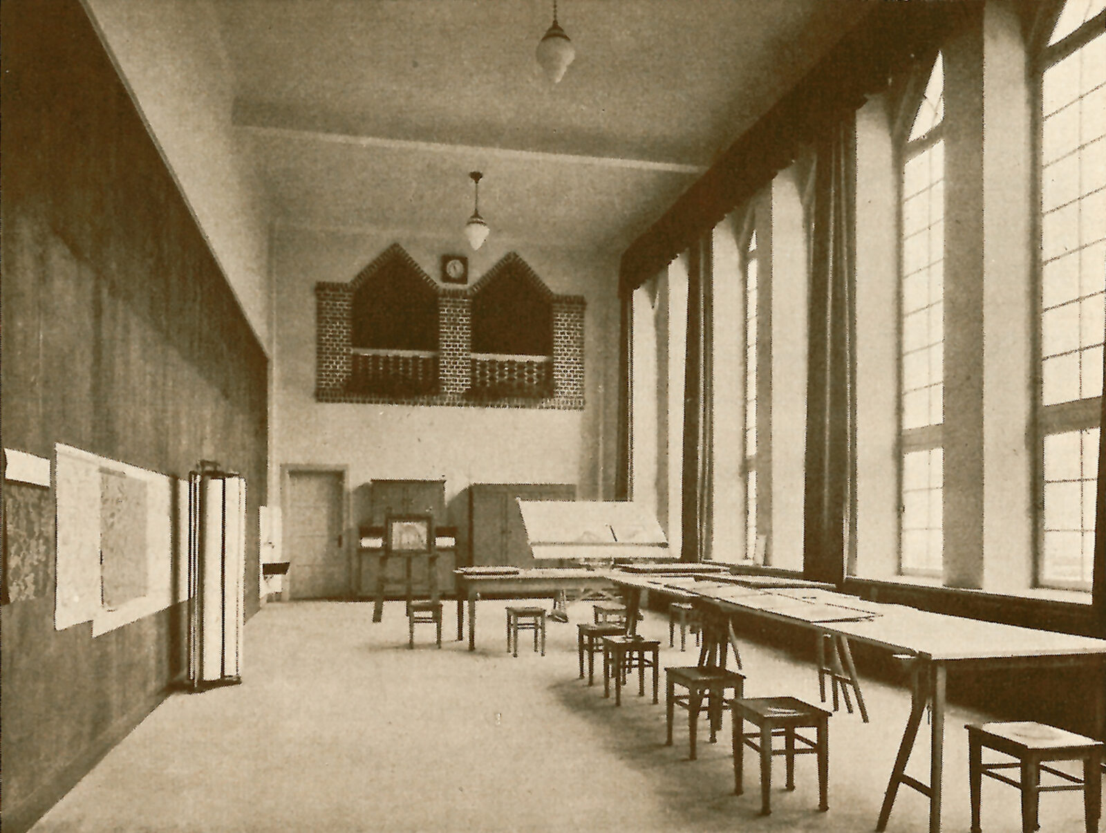 Die originale Bausubstanz wurde, soweit noch vorhanden, erhalten: Die ehemaligen gemauerten expressiven Doppelbögen, die im Zeichensaal als Einfassung einer Balustrade dienten, wurden rekonstruiert sowie vorhandene Terrazzoböden freigelegt und aufgearbeitet. Neu eingefügte Oberflächen (geräuchertes Fischgrätparkett, schwarz eingefärbte Sperrholzplatten sowie unbehandelte Kupfer- und Spiegelflächen) ergänzen diese Materialien.
