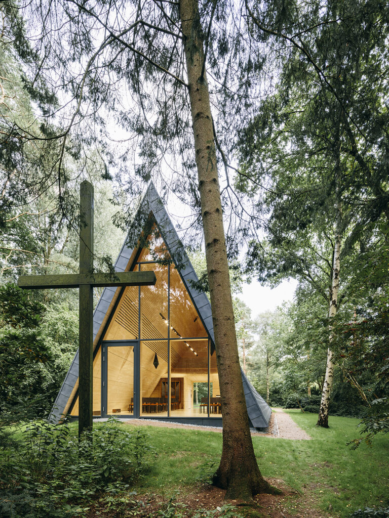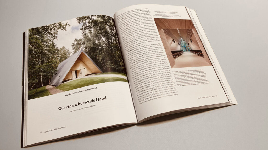 Im aktuellen Jahrbuch Architektur in Hamburg 2022/23 sind wir mit unserem Projekt „Neubau der Kapelle auf dem Waldfriedhof in Wedel“ vertreten. Cornelia Krause rezensiert darin unseren Entwurf, ein Remake des Vorgängerbaus als Einraumgebäude, der sich durch seine leicht geschwungene Dachform und seine reduzierte Materialwahl auszeichnet.
